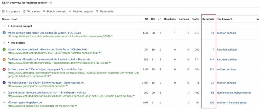 In der markierten Spalte „Keywords“ siehst du, dass alle Seiten zu diesem Suchbegriff nicht nur für den Suchbegriff selbst, sondern für noch viel mehr Keywords ranken. Position 5 sogar für 144 verschiedene Keywords!