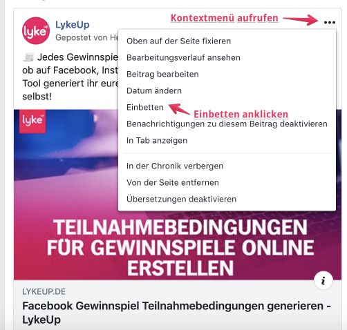 5. Nutze die „Einbetten“ Funktion deiner Facebook Seite