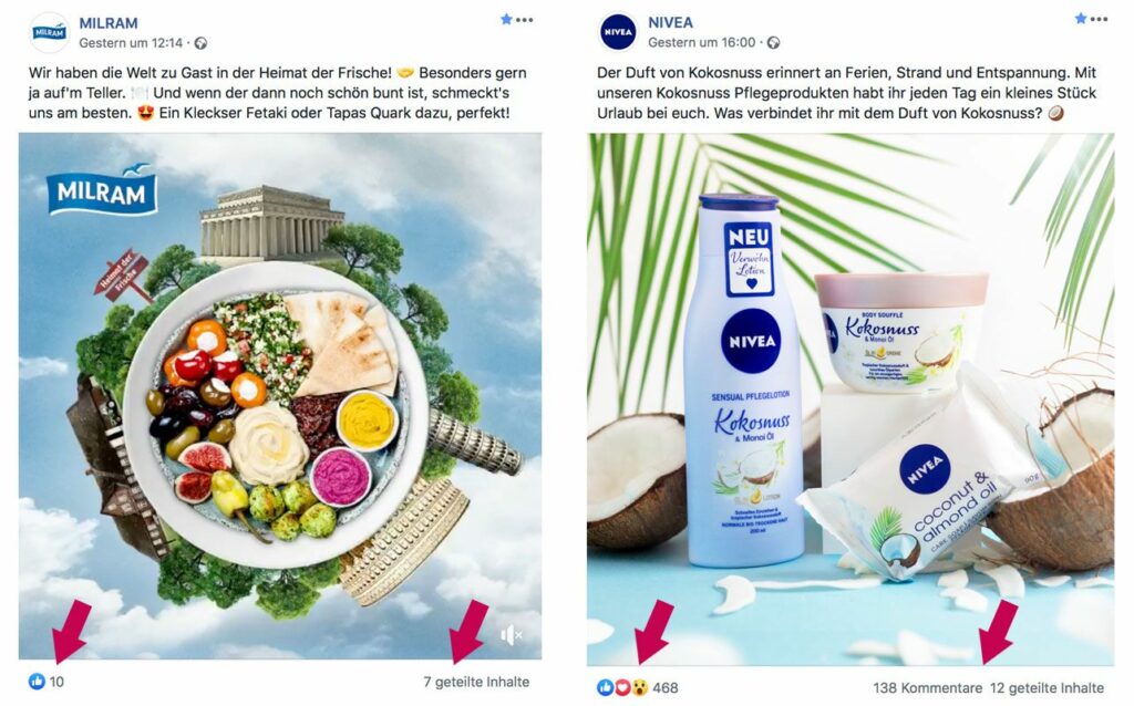 Im unteren Bereich der Posts siehst du jeweils, wie viele Likes und Kommentare die beiden Posts so abgeräumt haben. Ein sehr bemerkenswerter Unterschied, oder 😉